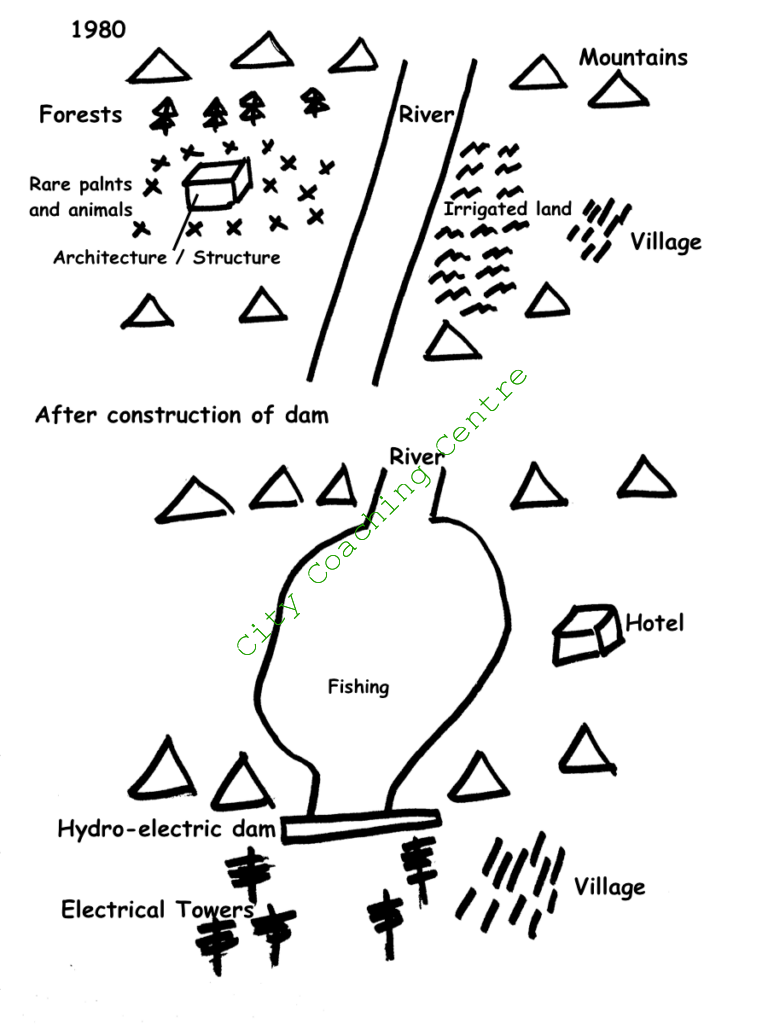 In 1965, there was a Tam River flowing from north to south, with a branch flowing from the west to the east. Between this branch and the main river, in the northwest, some trees were there, whereas in the southwest, a city was there. A few houses were there in the northeast, whereas the southeast area was totally barren.