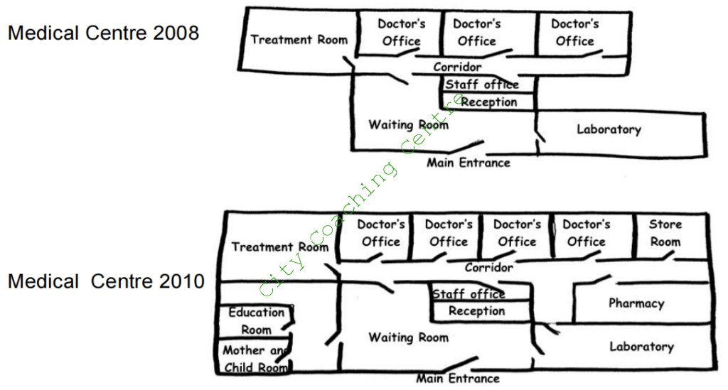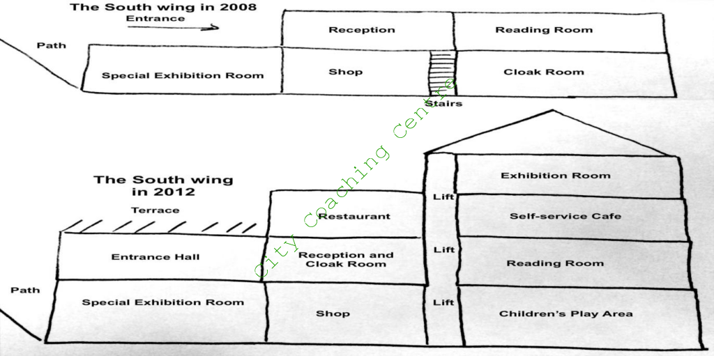 The diagrams below show the present building of a college and the plan for changes to the college site in the future. Summarize the information by selecting and reporting the main features, and make comparisons where relevant.
