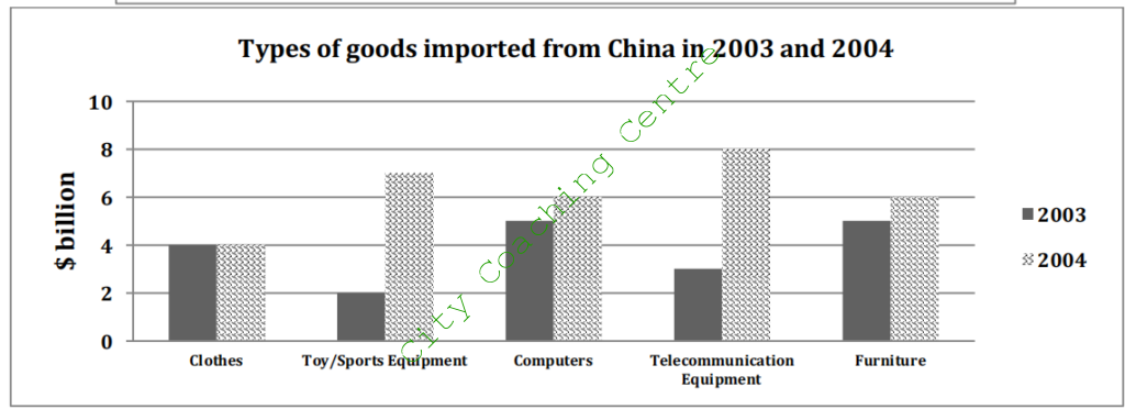 In 2004, imports of all things increased, except for clothes, which remained the same. There was a slight increase of $1 million in the import of computers and furniture. The greatest change can be seen in the import of toys/sport equipment and telecommunications equipment, which grew from $2 and $3 billion in 2003 to $7 and $8 billion respectively in 2004.