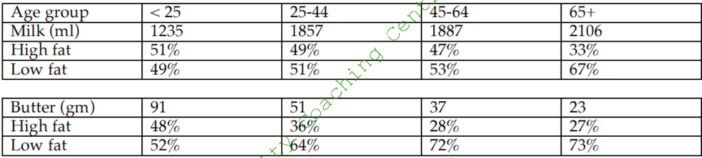 In the less than 25 year old age group, the intake of milk was 1235 ml, where as that of butter was 91 gram per week. Almost equal percentage consumed high-fat and low-fat milk and butter. Among the 25-44 your olds, the intake of milk was considerably more (1857ml), but their intake of butter was considerably lesser (51gm) than that of the younger age group. In this age group also, almost equal percentage had high-fat and low-fat milk, but high fat butter was consumed by only 36%, whereas the other 64% consumed low-fat butter. The 45- 64 age group had 1887 ml of milk weekly, but the butter intake was even lesser that the younger age groups at 37 gm per week. There was very slight difference in the percentage of high and low fat milk consumers, but slightly more than a quarter took high fat butter. The senior-most age group that is the 65+ age group consumed the highest amount of milk, and the lowest amount of butter per week, among the age groups given. In this age group only a third had high fat milk and high fat butter.