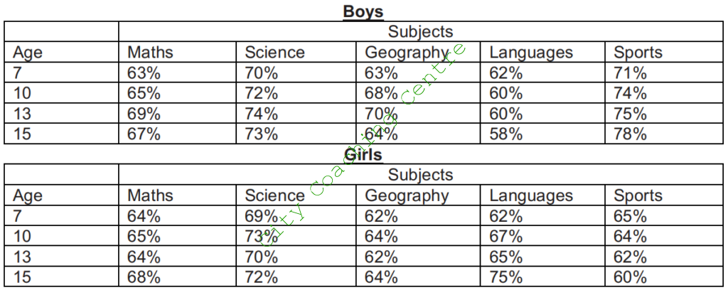 The tables show the average percentage of marks obtained in school subjects of Maths, Science, Geography, Languages and Sports by children aged 7,10,13 and 15 according to sex.