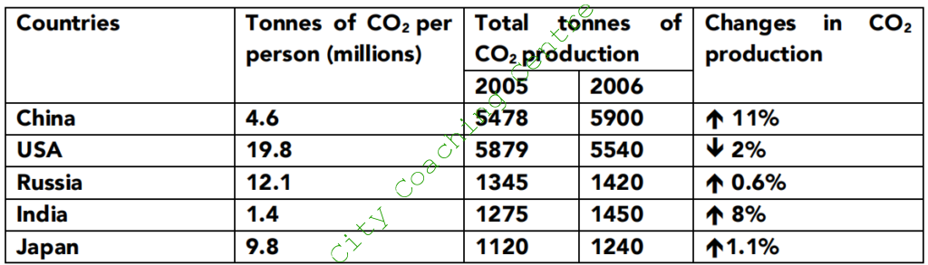 It is manifest from the table that the developed countries had a high per capita emission of CO2. The USA produced 19.8 million tonnes of CO2 per person, which was followed by Russia and Japan at 12.1 and 9.8 million tonnes/person respectively. China produced 4.6 million tonnes CO2 per person. India produced the least CO2 per person, which was 1.4 million tonnes.