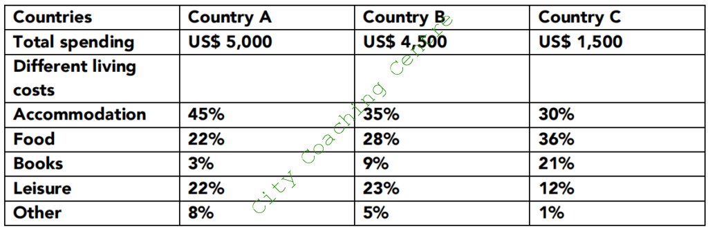 The table below gives information about the average annual spending of university students in three different countries. Summarise the information by selecting and reporting the main features and make comparisons where relevant.